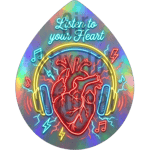 An anatomical heart in neon - wired up, plugged in, and absolutely not taking requests: Listen to Your Heart pairs a detailed medical heart illustration with glowing neon headphones, lightning bolts, and floating music notes on a holographic transparent finish that shifts with every angle. The kind of sticker that looks like it was smuggled out of a neon sign shop. Lands perfectly on a laptop lid, water bottle, guitar case, journal, phone case, or anywhere else that needs a pulse.