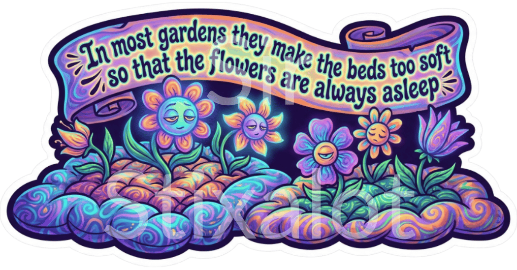 A garden where the beds are too soft and the flowers have simply given up on consciousness: this die-cut psychedelic sticker delivers drowsy, dreamy blooms in swirling purples, neons, and golds beneath a scroll banner carrying one of literature's most quietly devastating observations. Die-cut to the shape of the design with rich illustrated detail that holds up on a laptop lid, water bottle, journal, phone case, or notebook.
